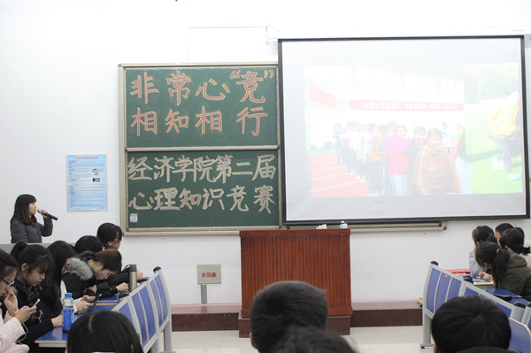 为在大学生群体普及心理健康知识,提高大学生心理素质,营造人人关注大学生心理健康的良好氛围,12月16日,经济学院于长清湖校区经济学院综合楼107教室举办“非常心‘竟’ 相知相行”第二届大学生心理知识竞赛,学院2016、2017级百余名同学参与其中,比赛由学生会骨干担任评委,心理健康部成员邓君梅担任主持。